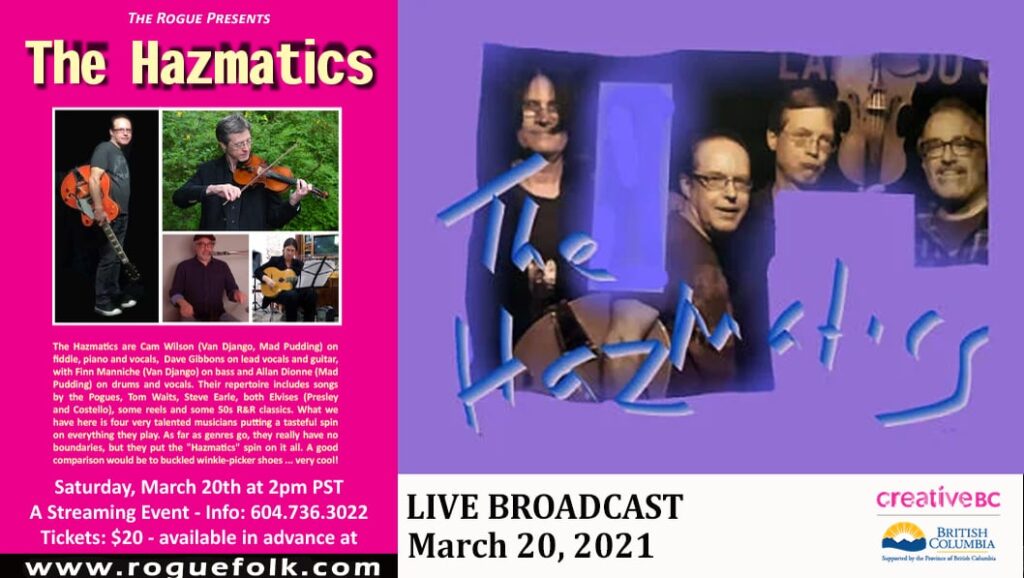 The Hazmatics are Cam Wilson (Van Django, Mad Pudding) on fiddle, piano and vocals, Dave Gibbons on lead vocals and guitar, with Finn Manniche (Van Django) on…